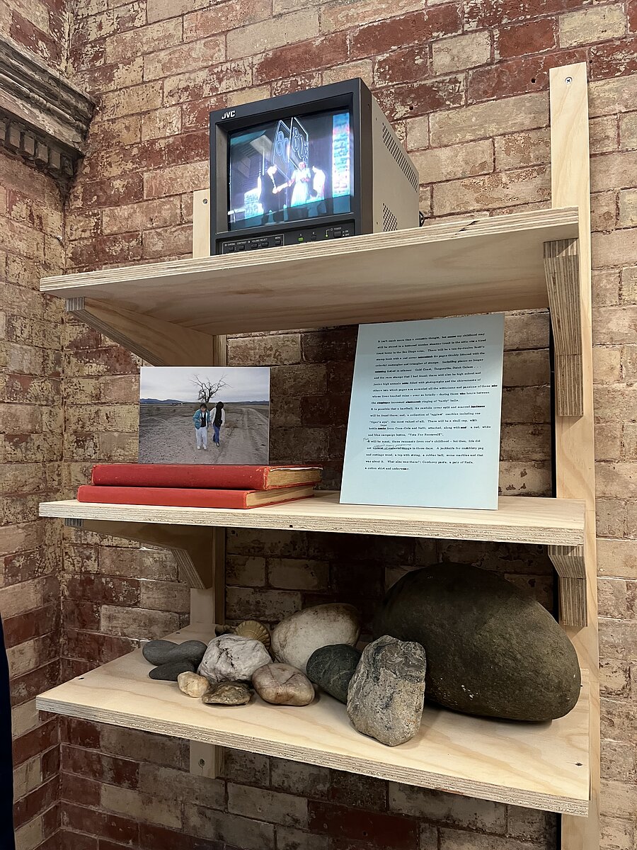 Tajiri’s video, installed in the gallery’s foyer within a newly commissioned installation, History, Memory, Vertical Stack (2024), is a subtle thread to the West Coast origins of the Asian American movement; it was at UC Berkeley where student activists coined the panethnic term amid a growing identity consciousness. It is also a reminder that the works within the exhibition build on and are in dialogue with concerns reaching beyond New York. Inspired by roadside memorials, History, Memory, Vertical Stack is also fittingly at a threshold, delineating the boundaries and in-between spaces that exhibiting artists negotiated in their respective searches for images and words, creating the language amiss in their own histories and memories.