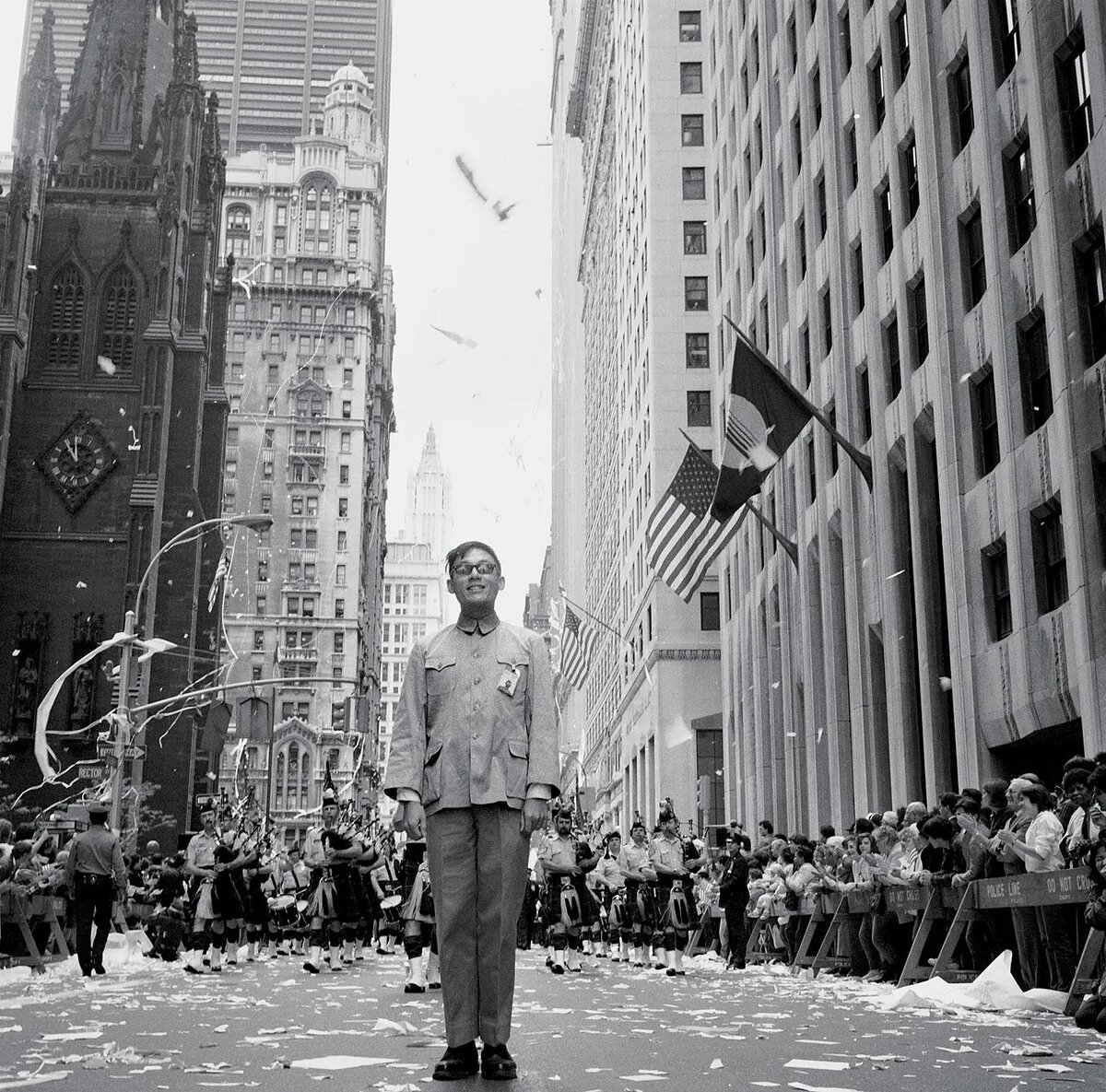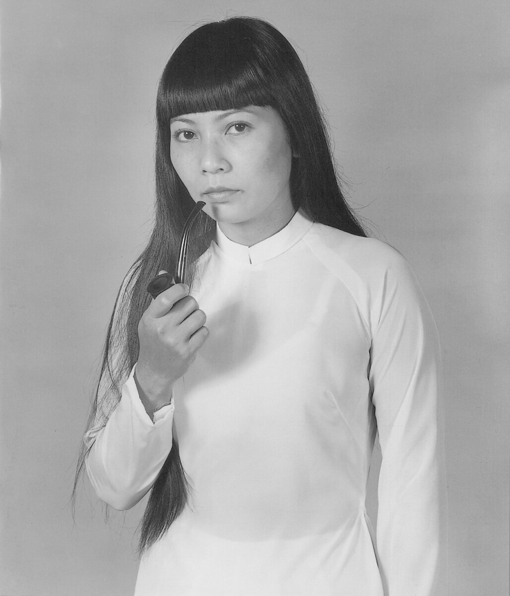 By that period, the artist Tseng Kwong Chi had created the bulk of his 10-year series of highly public self-portraits taken at international landmarks, beginning in New York. Dressed in a Mao suit, Tseng presented as a kind of emissary, visibly out of place yet, as exemplified by an isolated portrait amid a crowded Veterans Day Parade in Manhattan, still invisible. His poses echo the stance of an indelible 1985 portrait by Hanh Thi Pham, in which the artist, shown waist up, wearing a crisp áo dài–like shirt, and holding a pipe, seems to anticipate and rebuke any assumption that might accompany the gaze that meets her inscrutable, piercing one. In a nearby photo by Simon Leung, a pose alone carries racial connotations. The image of him squatting nonchalantly in Vienna considers how instincts translate and shift across geographies. To closely examine the work, hung low, viewers are compelled to squat too.